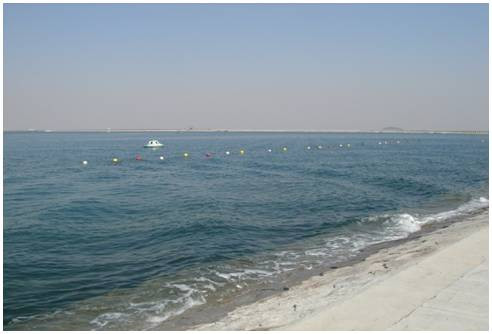 上海金山城市沙灘海域面積1.5平方公里。經3個月的水體生態修復,水質由V類提高到I-II類(GB3838-2002),氨氮和活性磷檢測不出,全年透明度3-6米,海水碧藍清澈。